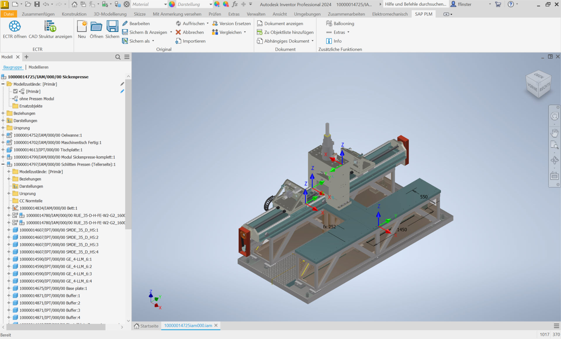 Inventor-Nutzer:innen arbeiten in ihrer gewohnten Konstruktionsumgebung und laden zusammenhängende Inventor-Originale über das integrierte SAP ECTR-Menü im Ribbon direkt zur Bearbeitung oder zur Anzeige aus dem SAP-System.
